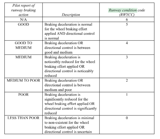 condition code (RWYCC) and a description of the runway surface are reported which can be used by the flight crew for