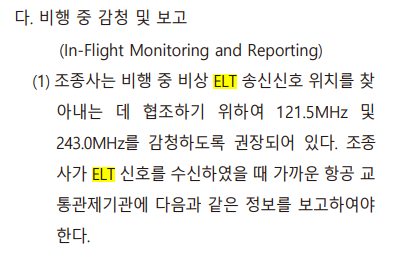 1) 비행 중 있을 수 있는 비상 ELT 송신의 식별에 도움을 주기 위하여 121.5 MHz 및 243.0 MHz를 경청할 것을 조종사에게 권고하고 있다. 신호를 청취하였다면 즉시 가장 인접한 항공 교통시설에 다음 사항을 통보하여야 한다.