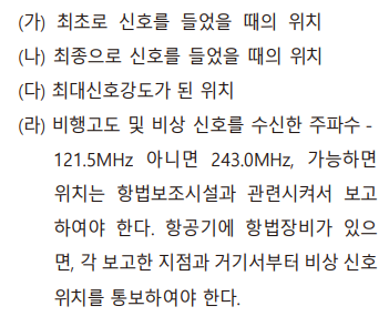 라) 비행고도 및 비상 신호를 수신한 주파수 (121.5 MHz 또는 243.0 MHz). 가능하면 항행안전시설과 관련된 위치를 제공하여야 한다. 항공기가 homing 장비를 갖추고 있다면, 각 보고위치와 함께 비상 신호의 방위(bearing)를 제공한다