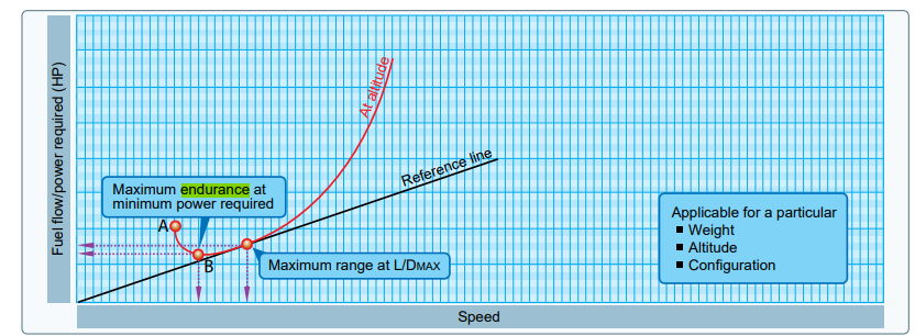 Fuel flow can be defined in either pounds or gallons. If maximum endurance is desired, the flight condition must provide a minimum fuel flow. In Figure 11-11 at point A, the airspeed is low and fuel flow is high. This would occur during ground operations or when taking off and climbing. As airspeed is increased, power requirements decrease due to aerodynamic factors, and fuel flow decreases to point B. This is the point of maximum endurance. Beyond this point, increases in airspeed come at a cost. Airspeed increases require additional power and fuel flow increases with additional power. Cruise flight operations for maximum range should be conducted so that the aircraft obtains maximum specific range throughout the flight. The specific range can be defined by the following relationship.