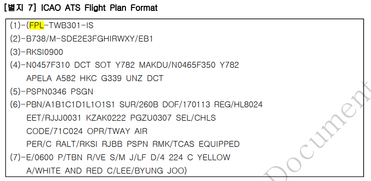 2) 항공기 종류 (예:B738): Wake Turbulence Category 및 Radio, Navigation, Transponder Code 장비를 의미한다.