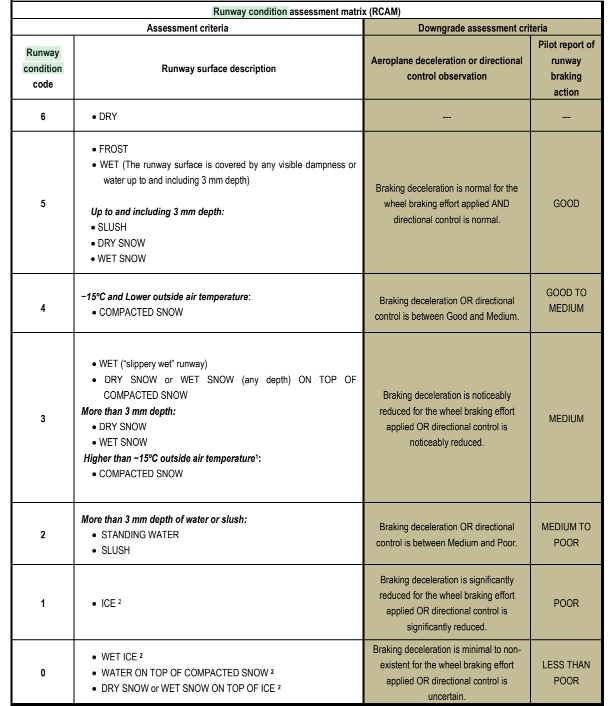 ICAO ( Ref Doc 9981. PANS - Aerodoms) 1. Runway Condition Report(RCR) 2.1.1.3 The philosophy of the RCR is that the aerodrome operator assesses the runway surface conditions whenever water, snow, slush, ice or frost are present on an operational runway. From this assessment, a runway condition code (RWYCC) and a description of the runway surface are reported which can be used by the flight crew ..